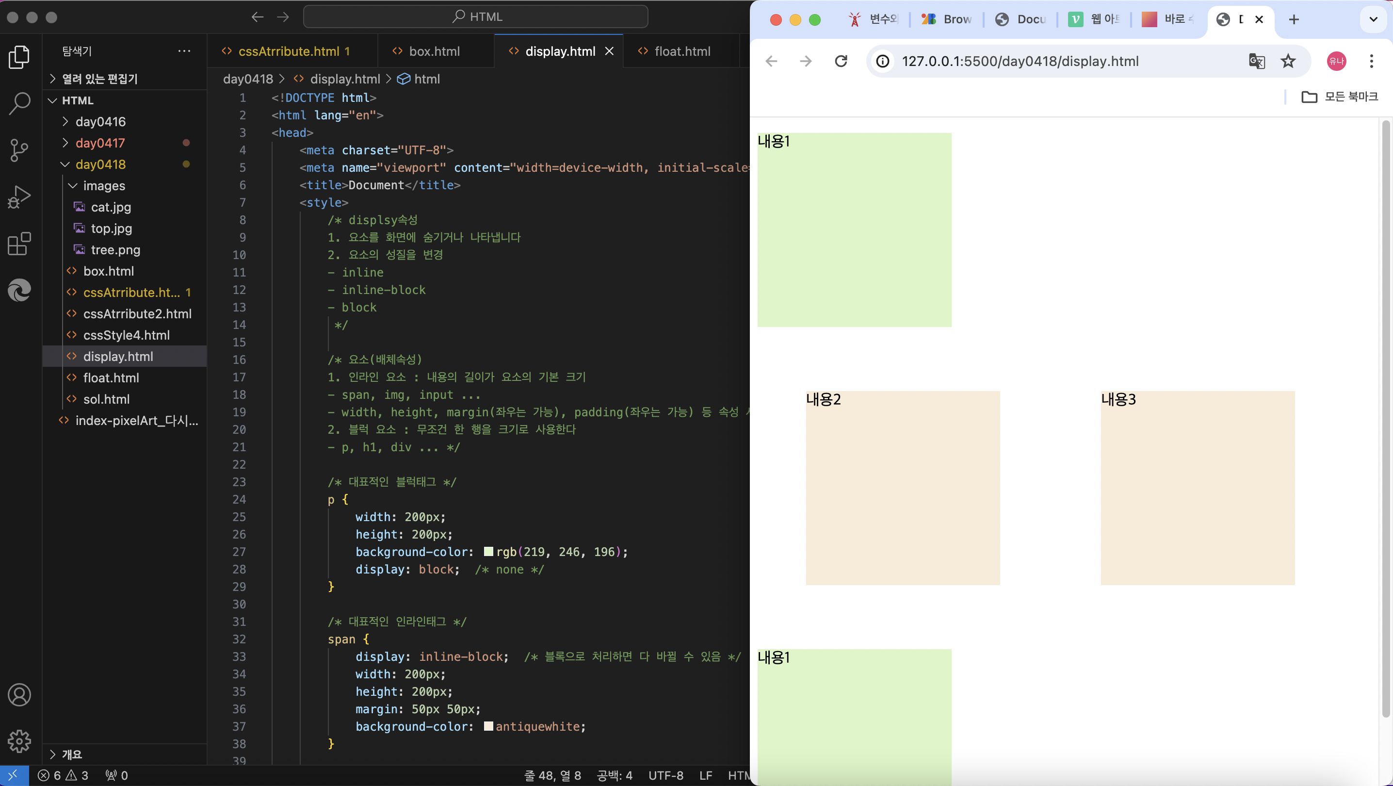아래 화면은 display 속성에서 인라인과 블록의 차이를 알기 위해 구현해본 것