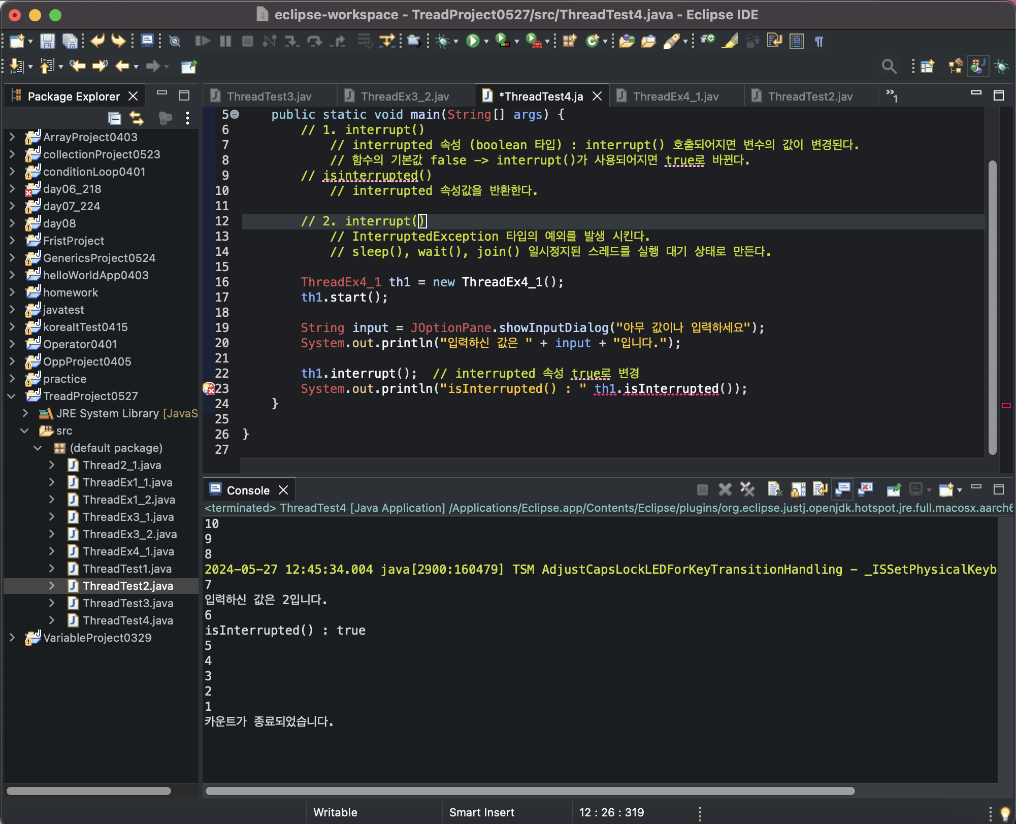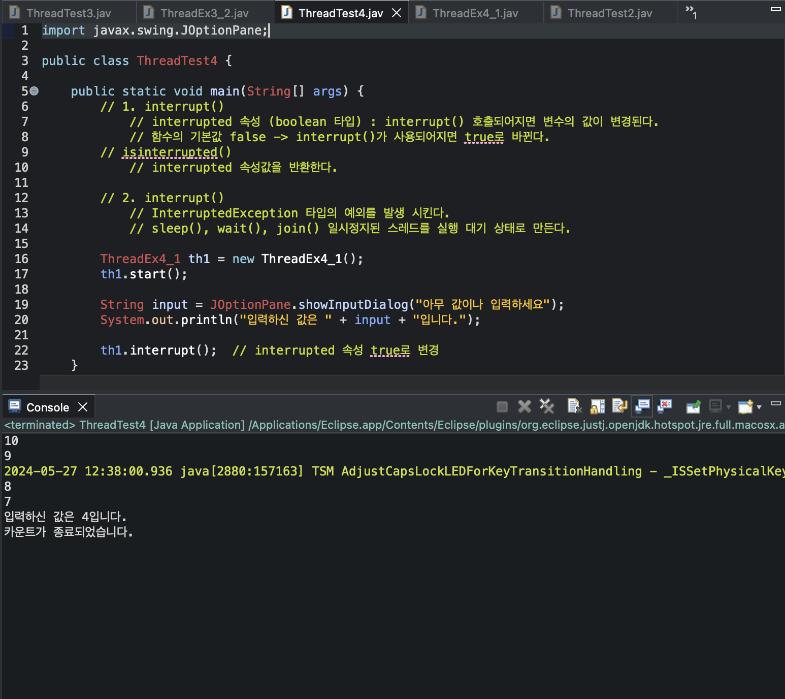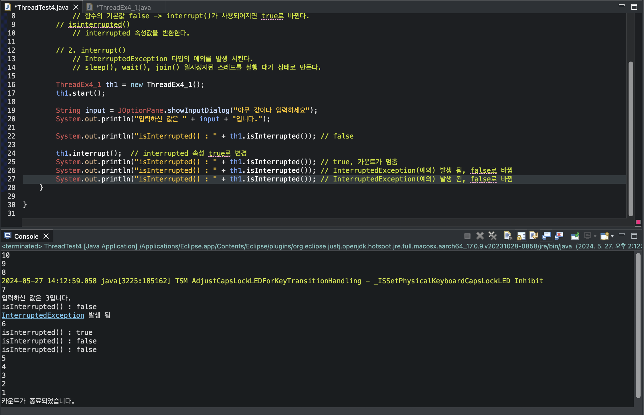 System.out.println("isInterrupted() : " + th1.isInterrupted()); // true, 카운트가 멈춤