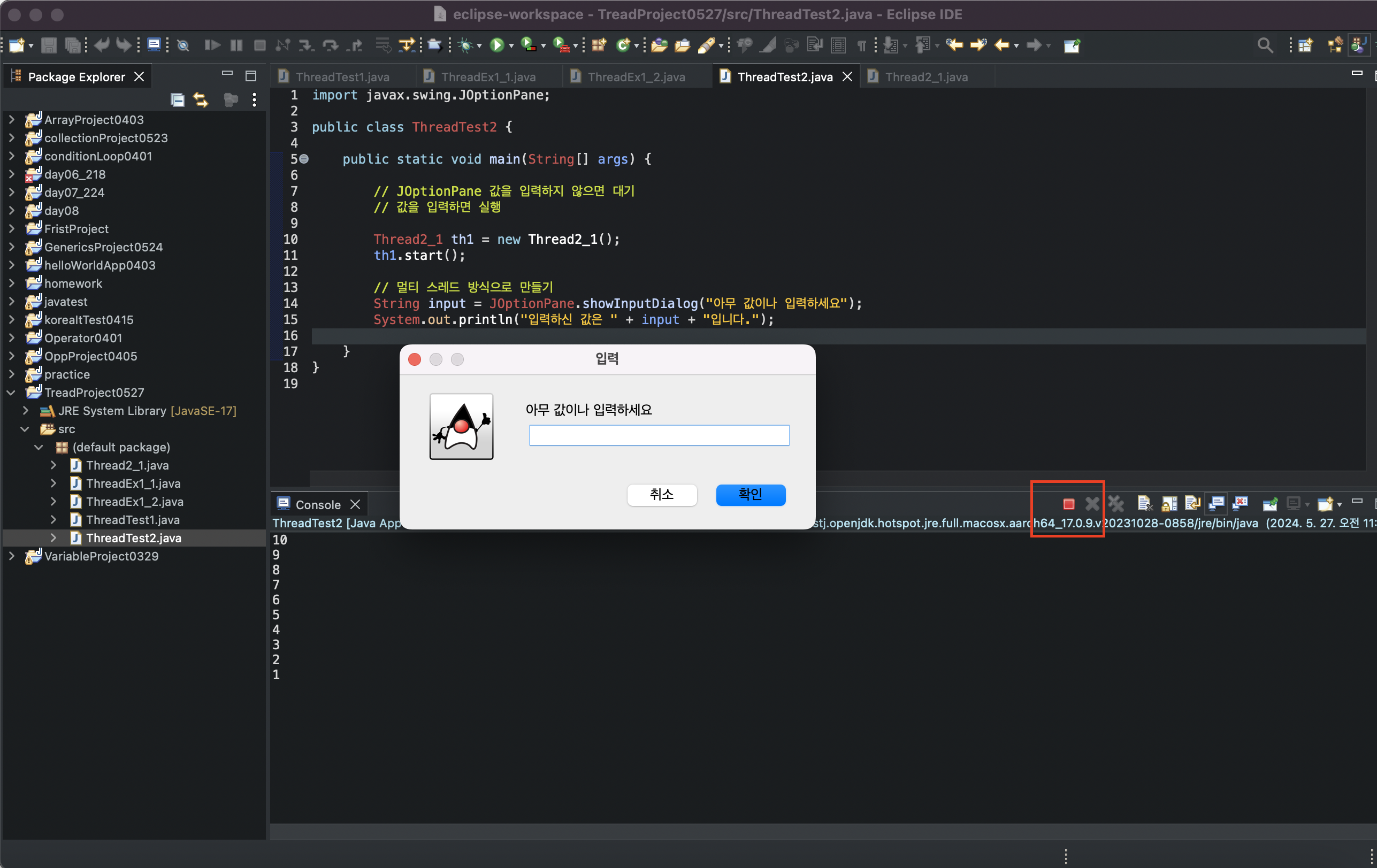 th1.suspend(); // th1 thread를 일시정지 상태로 만들어라, 2초 후 실행