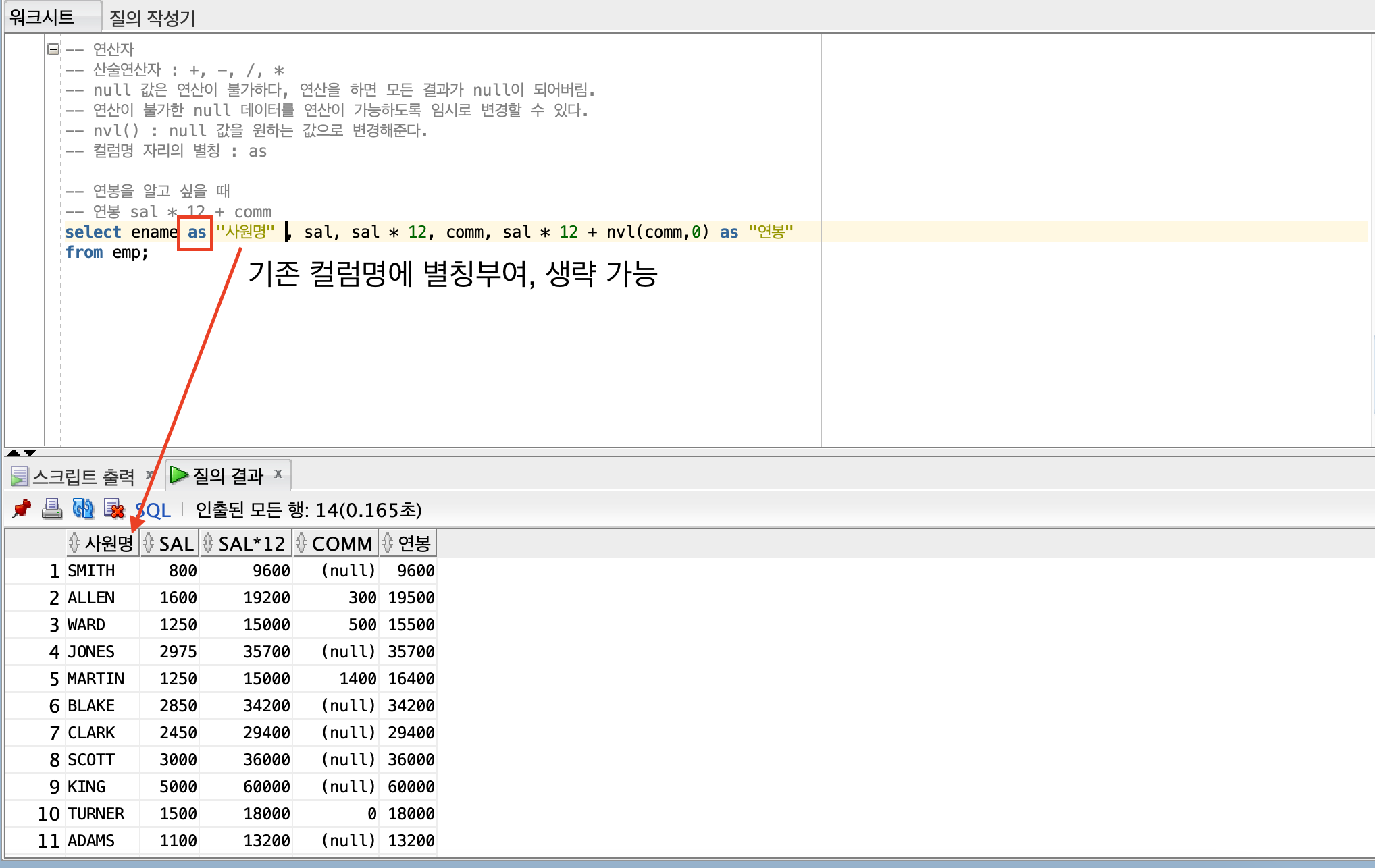 select ename "사원명" , sal, sal * 12, comm, sal * 12 + nvl(comm,0) as "연봉"