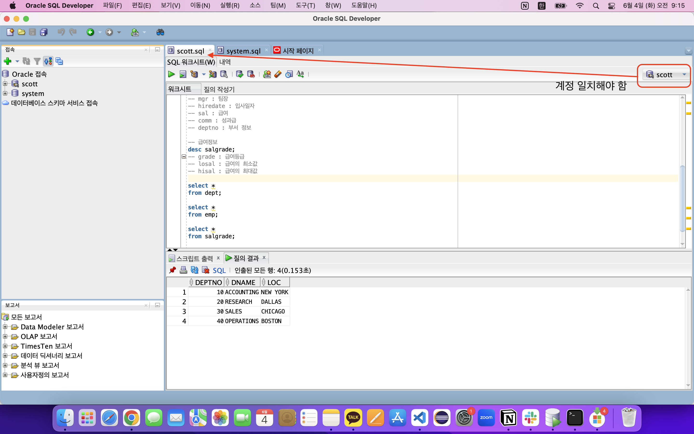 오라클 scott 계정 등록까지 완료