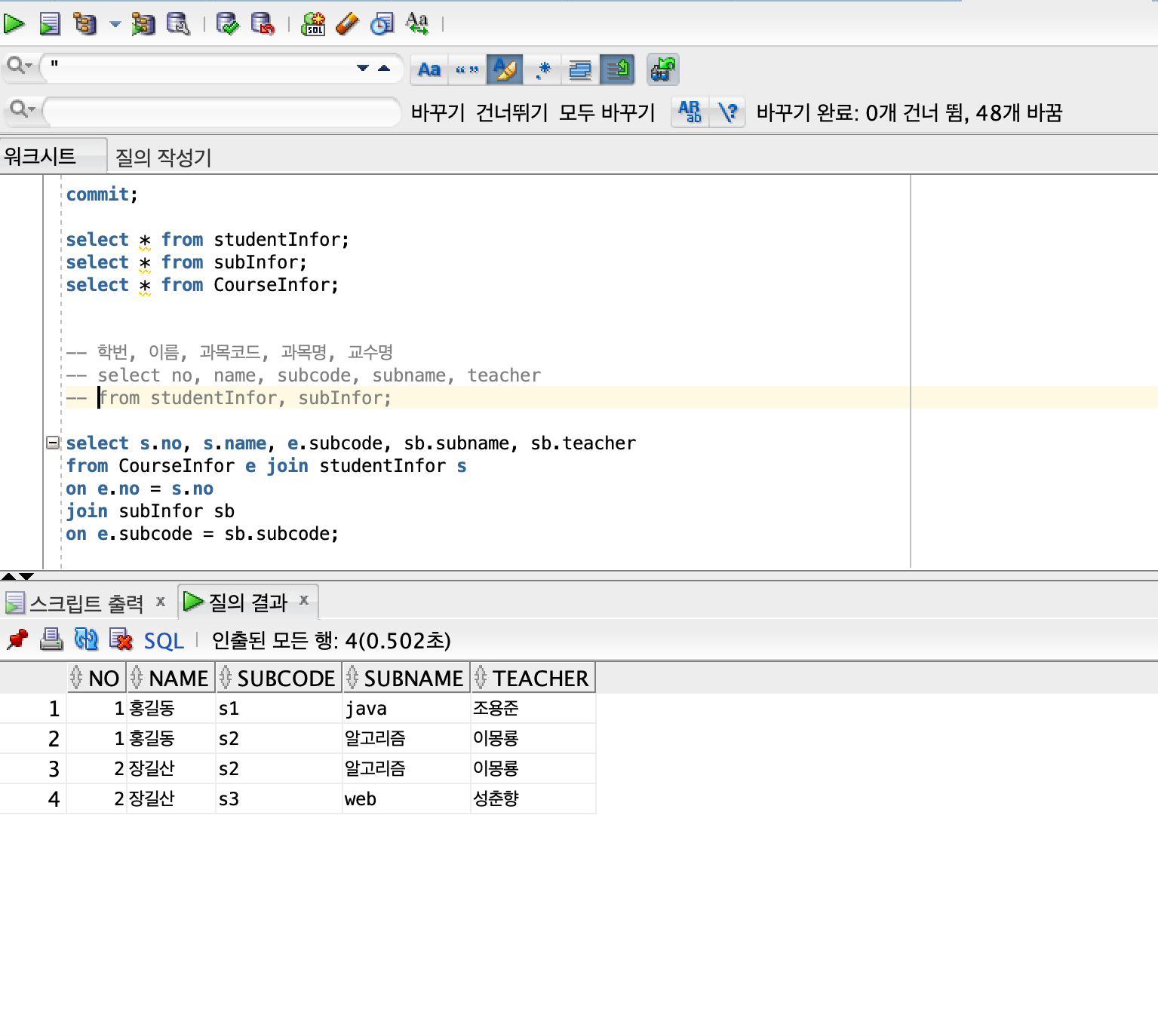 -- 학번, 이름, 과목코드, 과목명, 교수명