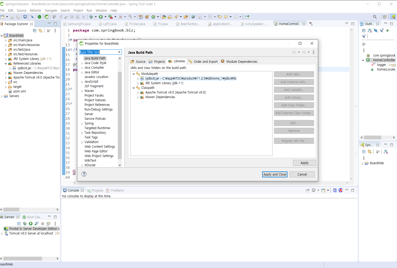 프로젝트의 build path 에 들어가서 ojdbc6를 연결한다. 맥에서는 11로 해야한다.