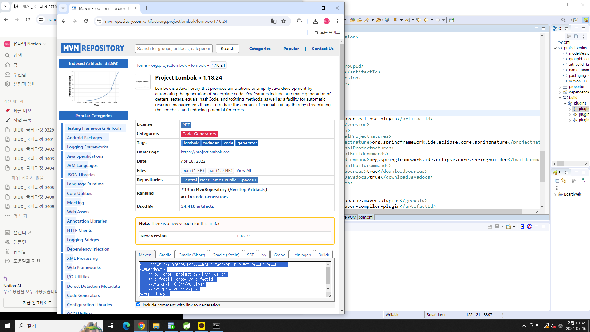롬북을 배포하기 위해 maven에 들어가 <dependency> 부분을 긁어 pom.xml에 넣는다.